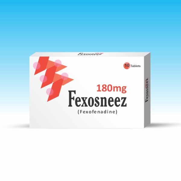 Fexosneez 180mg Tablets contain Fexofenadine Hydrochloride, a potent, long-acting second-generation antihistamine used primarily for the relief of symptoms associated with chronic idiopathic urticaria (hives), including itching and rash, and for allergic rhinitis. Fexofenadine is a non-sedating agent that selectively blocks peripheral H1 receptors without crossing the blood-brain barrier.